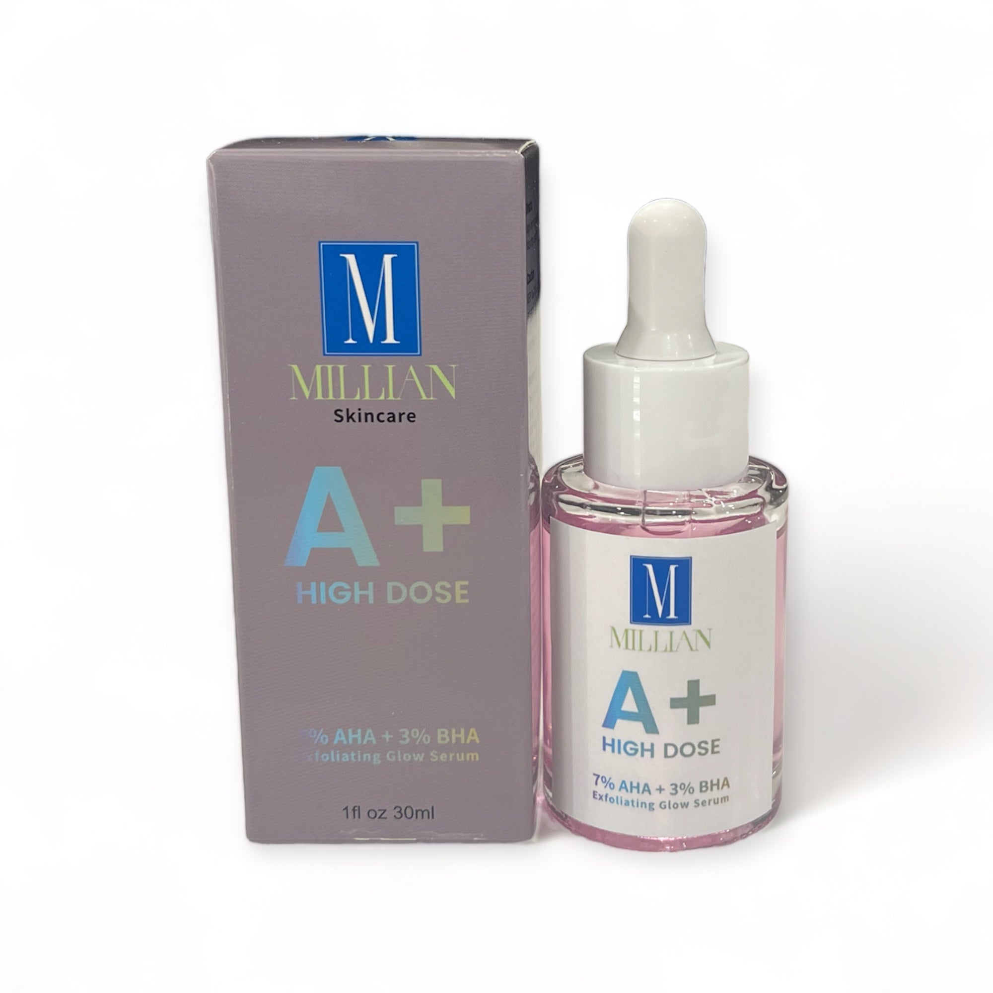 Millian Skincare's A+ High Dose 7% AHA + 3% BHA Exfoliating Glow Serum, a powerful and transformative serum designed to renew and revitalize your skin. This potent formula combines the exfoliating prowess of alpha hydroxy acids (AHA) and beta hydroxy acids (BHA) to gently dissolve dull, built-up skin cells, revealing a radiant and youthful complexion. The high concentration of AHA and BHA promotes gentle but effective exfoliation, targeting uneven skin texture, clogged pores, and signs of aging. Infused with skin-nourishing ingredients, this serum works to improve skin tone, reduce the appearance of fine lines, and enhance overall skin clarity. Experience the rejuvenating power of Millian Skincare's A+ High Dose Exfoliating Glow Serum for a visibly smoother, brighter, and more luminous complexion.